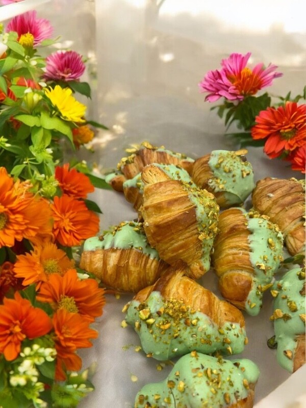 Ingredientes: Farinha de trigo francesa, leite integral pasteurizado, leite condensado, manteiga, chocolate branco, creme de leite, pistache em grãos, farofa de pistache, açúcar refinado, fermendo fresco doce, sal e ovo in natura.